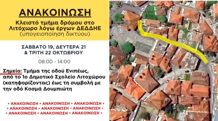 Σύμφωνα με ενημέρωση του ΔΕΔΔΗΕ την Πέμπτη 17, Παρασκευή 18 και Σάββατο 19 Οκτωβρίου 2024 και ώρες 08:00-14:00 θα είναι κλειστό το τμήμα της...