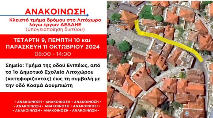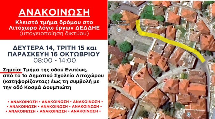 Σύμφωνα με ενημέρωση του ΔΕΔΔΗΕ την Τετάρτη 9, Πέμπτη 10 και Παρασκευή 11 Οκτωβρίου 2024 και ώρες 08:00-14:00 θα είναι κλειστό το τμήμα της...