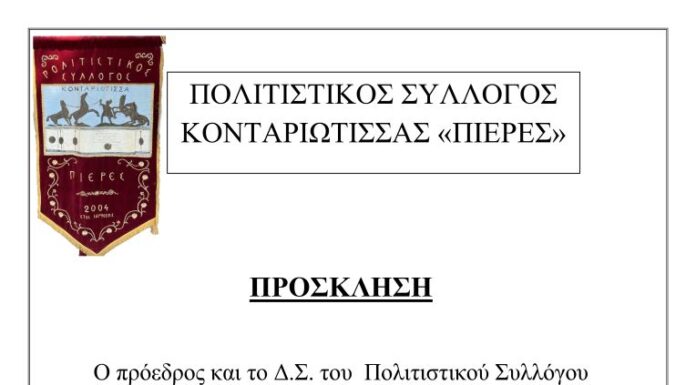Ο πρόεδρος και το Δ.Σ. του Πολιτιστικού Συλλόγου Κονταριώτισσας «Πίερες» σας προσκαλούν στο «Αντάμωμα Κουντουριανών» που θα πραγματοποιηθεί την Κυριακή 8 Σεπτεμβρίου στον προαύλιο...