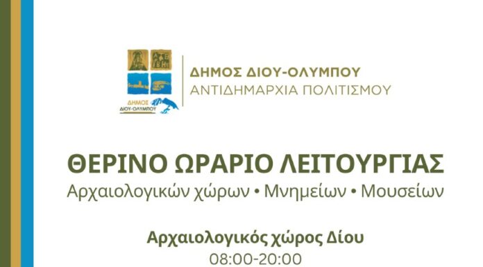 Το θερινό ωράριο λειτουργίας αρχαιολογικών χώρων, μνημείων και μουσείων διαμορφώνεται ως εξής: Αρχαιολογικός χώρος Δίου: 8:00-20:00 Αρχαιολογικό Μουσείο Δίου: 8:00-20:00 (Τρίτη 11:00-18:00) Αρχαιοθήκη Δίου:...