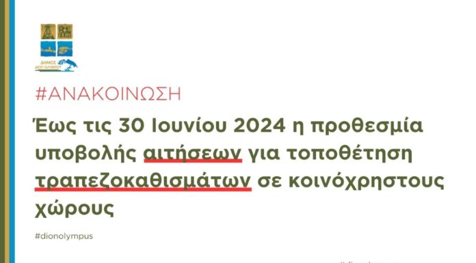 Ο Δήμος Δίου-Ολύμπου ανακοινώνει ότι, όσοι δημότες επιθυμούν να κάνουν χρήση κοινόχρηστου χώρου (πεζοδρόμια, πλατεία, πεζόδρομοι κ.λπ.) για την τοποθέτηση τραπεζοκαθισμάτων ή εμπορευμάτων για...