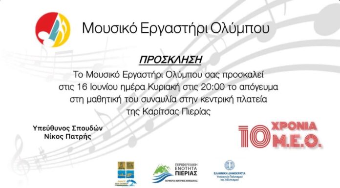 Το Μουσικό Εργαστήρι του Ολύμπου συνεχίζοντας το 10ετές αξιέπαινο έργο του παρουσιάζει αύριο Κυριακή 16/6 και ώρα 20:00, στην πλατεία της Καρίτσας την Μαθητική...