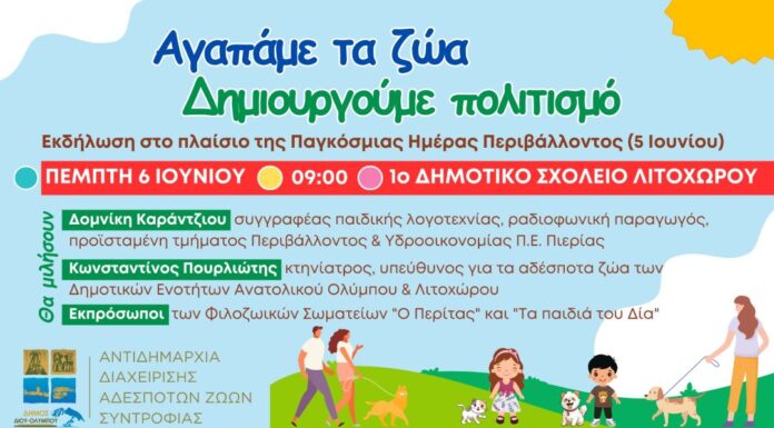 Με σύνθημα «Αγαπάμε τα ζώα - Δημιουργούμε Πολιτισμό» η Αντιδημαρχία Διαχείρισης Αδέσποτων Ζώων Συντροφιάς του Δήμου Δίου-Ολύμπου διοργανώνει ενημερωτική εκδήλωση στο πλαίσιο της 5ης...