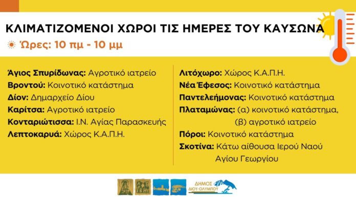 Λόγω των ιδιαίτερα υψηλών θερμοκρασιών που αναμένεται να επικρατήσουν από αύριο Τετάρτη 12 Ιουνίου 2024, ανακοινώνεται ότι ο Δήμος Δίου-Ολύμπου διαθέτει τους παρακάτω κλιματιζόμενους...