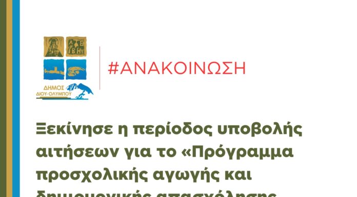 Ο Δήμος Δίου Ολύμπου ενημερώνει τους ενδιαφερόμενους γονείς, που επιθυμούν τη φιλοξενία των παιδιών τους στους Παιδικούς Σταθμούς της Λεπτοκαρυάς, του Λιτοχώρου και της...
