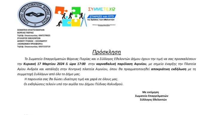 Το Σωματείο Επαγγελματιών Β. Πιερίας και ο Σύλλογος Εθελοντών Δήμου διοργανώνουν, υπο την αιγίδα του Δήμου Πύδνας-Κολινδρού, καρναβαλική παρέλαση (με σημείο έναρξης Πλατεία Αγίου...