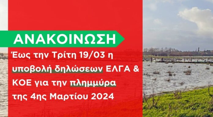 Σας ενημερώνουμε ότι η καταληκτική ημερομηνία υποβολής δηλώσεων ΕΛΓΑ & ΚΟΕ, που αφορούν στην πλημμύρα της 4ης Μαρτίου 2024, είναι η Τρίτη 19 Μαρτίου...