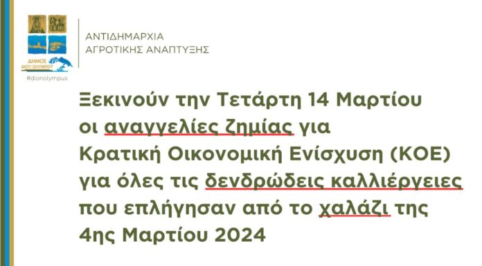 Από την Αντιδημαρχία Αγροτικής Ανάπτυξης ανακοινώνεται ότι ξεκινούν αύριο Τετάρτη 14 Μαρτίου 2024 οι αναγγελίες ζημίας για Κρατική Οικονομική Ενίσχυση (ΚΟΕ) για όλες τις...