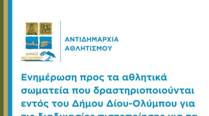 Η Αντιδημαρχία Αθλητισμού Δίου-Ολύμπου ενημερώνει τα αθλητικά σωματεία με έδρα τον Δήμο Δίου-Ολύμπου για τις διαδικασίες πιστοποίησης, στο πλαίσιο συμμετοχής τους στα «Προγράμματα Άθλησης...