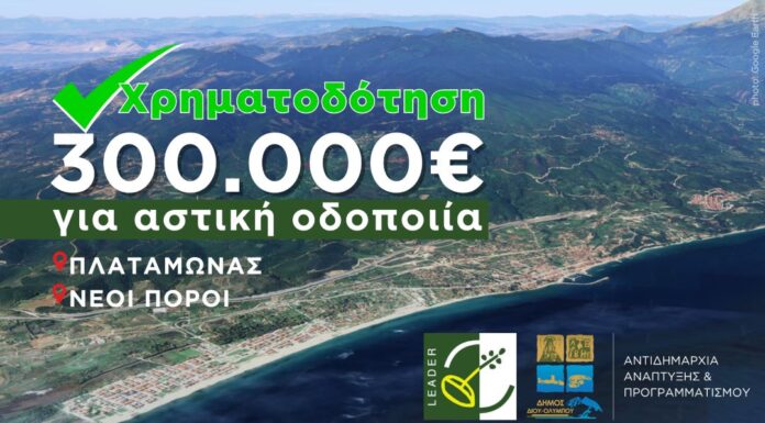 Με το ποσό των 300.000 ευρώ (με ΦΠΑ) χρηματοδοτήθηκε ο Δήμος Δίου-Ολύμπου από το Πρόγραμμα Leader, μέσω της Περιφέρειας Κεντρικής Μακεδονίας, μετά από πρόσκληση...