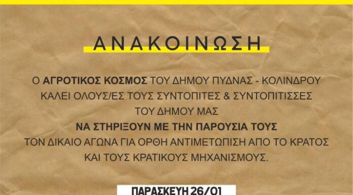 Ο αγροτικός κόσμος του Δήμου Πύδνας – Κολινδρού καλεί ολόκληρη την τοπική κοινωνία σε μια συγκέντρωση διαμαρτυρίας για τα σοβαρά προβλήματα του κλάδου. Παρασκευή 26/01...