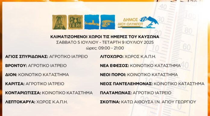 Λόγω των ιδιαίτερα υψηλών θερμοκρασιών που αναμένεται να επικρατήσουν από αύριο Σάββατο 5 Ιουλίου 2025, ανακοινώνεται ότι ο Δήμος Δίου-Ολύμπου διαθέτει τους παρακάτω κλιματιζόμενους...