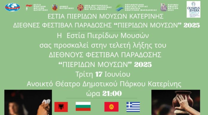 Η Εστία Πιερίδων Μουσών Κατερίνης, με ιδιαίτερη τιμή και χαρά σας προσκαλεί στο κλείσιμο "των Εαρινών Ημερών Μουσών 2025" με την τελετή λήξης του...
