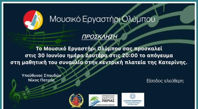 Το Μουσικό Εργαστήρι Ολύμπου σας καλεί στην εκδήλωσή '' Τελετή λήξης '' που θα γίνει στην πλατεία Ελευθερίας Κατερίνης στις 30 Ιουνίου ημέρα Δευτέρα στις...