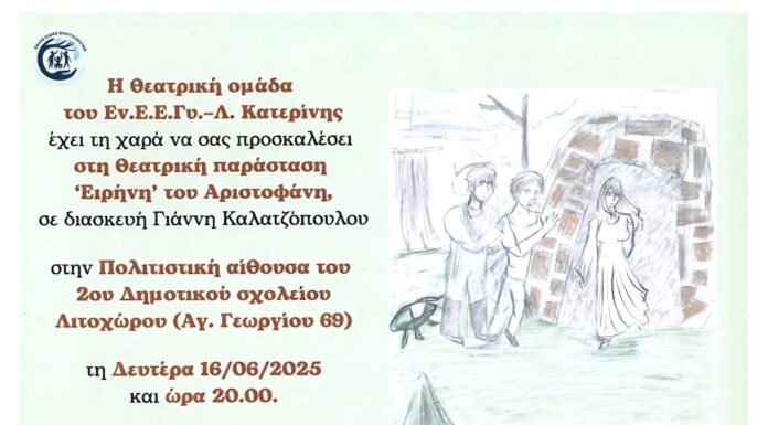Η Θεατρική Ομάδα του Εν.Ε.Ε.Γυ.-Λ. Κατερίνης έχει τη χαρά να σας προσκαλέσει στη θεατρική παράσταση "Ειρήνη" του Αριστοφάνη, σε διασκευή Γιάννη Καλατζόπουλου, στην πολιτιστική...