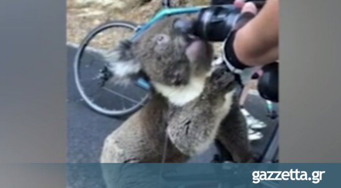 Ένα κοάλα, το οποίο μάλλον ήταν πολύ διψασμένο, σταμάτησε μια γυναίκα ποδηλάτη για να πιει νερό.  Οι θερμοκρασίες στην Αυστραλία είναι πολύ υψηλές και μάλιστα ...