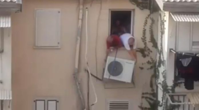 Δύο άνδρες προσπαθούν να εγκαταστήσουν ένα κλιματιστικό έξω από το παράθυρο ενός σπιτιού. Ο τρόπος που έχουν επιλέξει δεν είναι και ο πιο έξυπνος…...