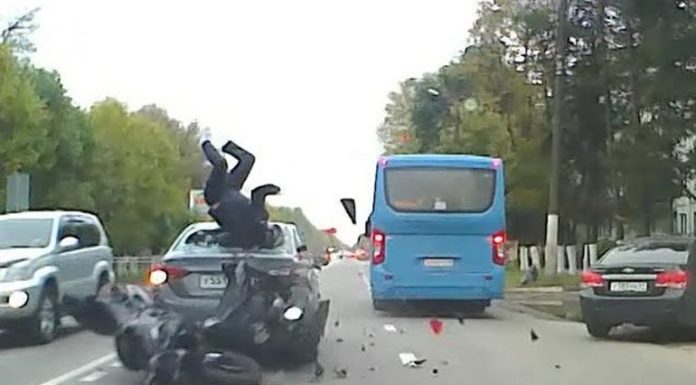 Σε έναν δρόμο της Ρωσίας, ένας μοτοσυκλετιστής επιχειρεί να προσπεράσει ένα λεωφορείο ενώ έρχεται από δεξιά με μεγάλη ταχύτητα. Ωστόσο, δεν θα προσέξει ένα...