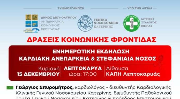 Ενημερωτική εκδήλωση για την καρδιακή ανεπάρκεια και τη στεφανιαία νόσο θα πραγματοποιηθεί την Κυριακή 15 Δεκεμβρίου 2024 στην αίθουσα του ΚΑΠΗ Λεπτοκαρυάς (ώρα: 17:00)....