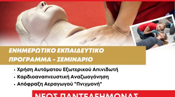 Συνεχίζει την Παρασκευή 17 Ιανουαρίου στο Νέο Παντελεήμονα ο κύκλος δωρεάν ενημερωτικών-εκπαιδευτικών σεμιναρίων χρήσης απινιδωτή, απόφραξης αεραγωγού «Πνιγμονή» και καρδιοαναπνευστικής αναζωογόνησης   Στην αίθουσα εκδηλώσεων του...