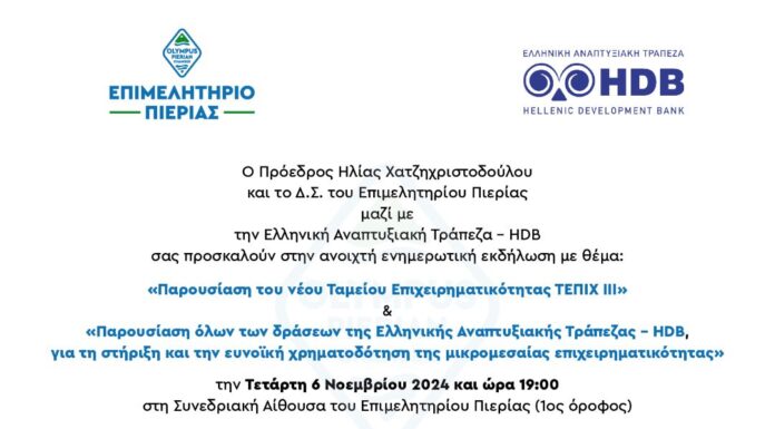 Ο Πρόεδρος Ηλίας Χατζηχριστοδούλου και το Δ.Σ. του Επιμελητηρίου Πιερίας μαζί με την Ελληνική Αναπτυξιακή Τράπεζα – HDB σας προσκαλούν στην ανοιχτή ενημερωτική εκδήλωση...