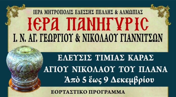 Την Τρίτη 6 Δεκεμβρίου πανηγυρίζει ο Ιερός Ναός Αγίων Γεωργίου και Νικολάου Γιαννιτσών. Στα πλαίσια του εορτασμού θα τεθεί σε προσκύνηση η Τιμία Κάρα του...