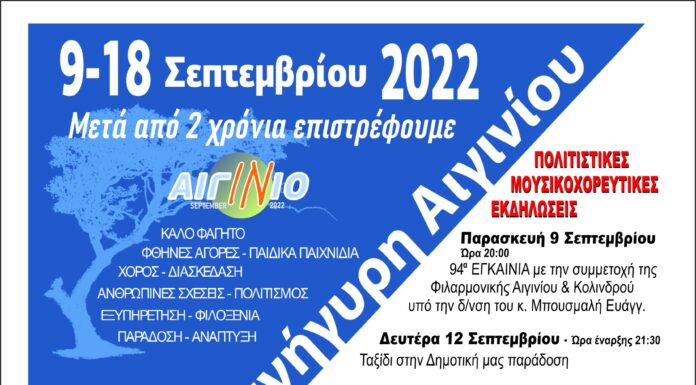 Ξεκινάει αύριο Παρασκευή 9-9-2022 και ώρα 20:00 η φημισμένη Εμποροπανήγυρη Αιγινίου. Επιστρέφει μετά από 2 χρόνια αναγκαστικής απουσίας λόγω του κοροναϊού. Ανανεωμένη, ανοίγει τις πύλες...