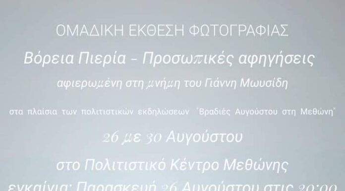 Το τοπικό συμβούλιο  της Κοινότητας Μεθώνης Πιερίας, σας προσκαλεί στα εγκαίνια της ομαδικής έκθεσης φωτογραφίας με τίτλο: «Βόρεια Πιερία- Προσωπικές αφηγήσεις» που διοργανώνεται στα...