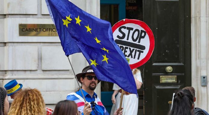 Διαδηλωτές κατά του Brexit έξω από το γραφείο του υπουργικού συμβουλίου στο Γουάιτχολ του Λονδίνου, την Πέμπτη 15 Αυγούστου. Την πιθανότητα συνεργασίας με το κόμμα...