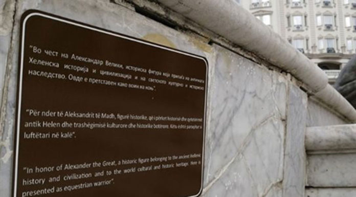 Πινακίδα που διευκρινίζει ότι ο Μέγας Αλέξανδρος αποτελεί μέρος της αρχαιοελληνικής ιστορίας και του αρχαιοελληνικού πολιτισμού τοποθετήθηκε στο βάθρο του μεγάλου αγάλματος στην κεντρική...