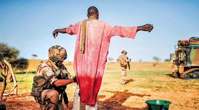 Σωματική έρευνα υπόπτου από άνδρες της επιχείρησης «Μπαρκάν», στο Ντάκι του Μάλι. Στα χωριά κανείς δεν εμφανίστηκε πρόθυμος να συνεργαστεί. ΓΚΟΣΙ, Μάλι. Μεγάλες δυσκολίες αντιμετωπίζουν...