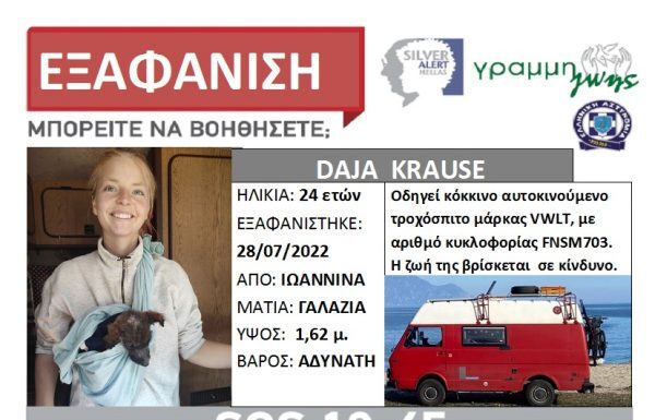 Τελευταία φορά εθεάθη στις 28 Ιουλίου 2022 στην περιοχή της Δωδώνης Ιωαννίνων, ενώ η τελευταία επικοινωνία με τους οικείους της, έγινε στις 29 Ιουλίου,...