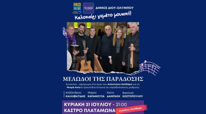 Ο Δήμος Δίου-Ολύμπου σας προσκαλεί σε μία καλοκαιρινή μουσική βραδιά με τους “Μελωδούς της Παράδοσης” την Κυριακή 31 Ιουλίου 2022 στις 9 μμ στο...