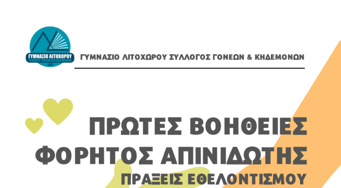Ενημερωτική εκδήλωση με θέμα «Πρώτες βοήθειες, φορητός απινιδωτής, πράξεις εθελοντισμού» διοργανώνει ο Σύλλογος Γονέων και Κηδεμόνων του Γυμνασίου Λιτοχώρου το Σάββατο 18 Ιουνίου 2022...